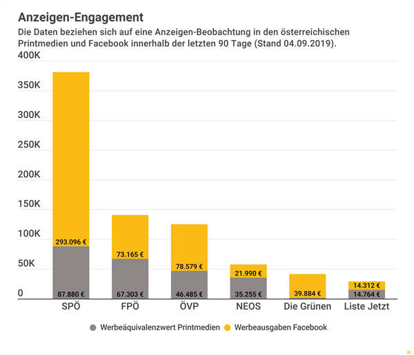 Die Wahlplakate hängen und Elefantenrunden finden statt. In Österreich beginnt der Kampf um möglichst viele Sitze im Nationalrat. Anhand bereits veröffentlichten Werbematerials lassen sich Kommunikationsstrategien der Parteien erkennen. Die »OBSERVER« Media Intelligence Analyse enthüllt die unterschiedlichen Kommunikationsansätze der Parteien in Print und auf Facebook innerhalb der letzten 90 Tage. Dafür stellte »OBSERVER« die öffentlichen Daten der Facebook-Seiten-Transparenz den Print-Analysedaten gegenüber.