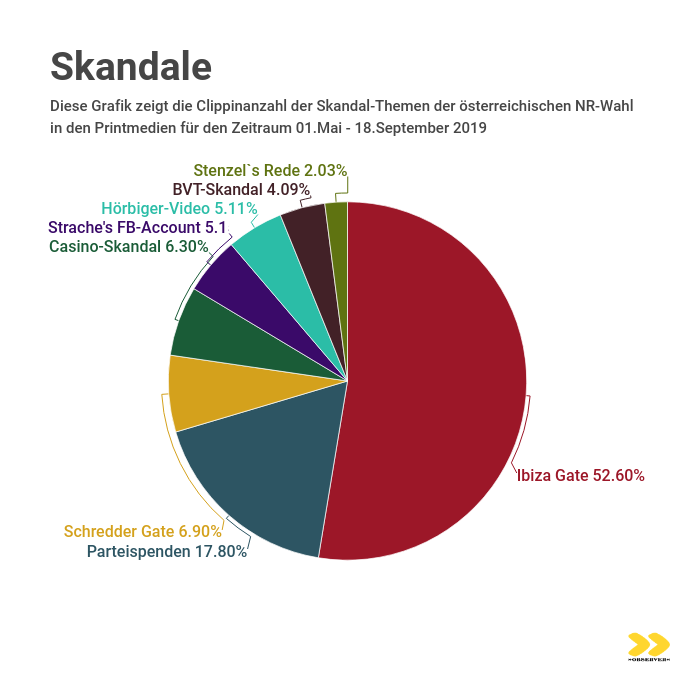 Das Jahr 2019 wird als ein Jahr der Politik-Skandale in die Geschichte der 2. Republik eingehen. Unmittelbar vor der Nationalratswahl prägen die Geschehnisse nicht nur die Stimmung in der Bevölkerung sondern auch die Wahlthemen der Parteien selbst. Ein Grund mehr für den »OBSERVER«, sich die Medienpräsenz und Resonanz der Skandale genauer anzusehen.