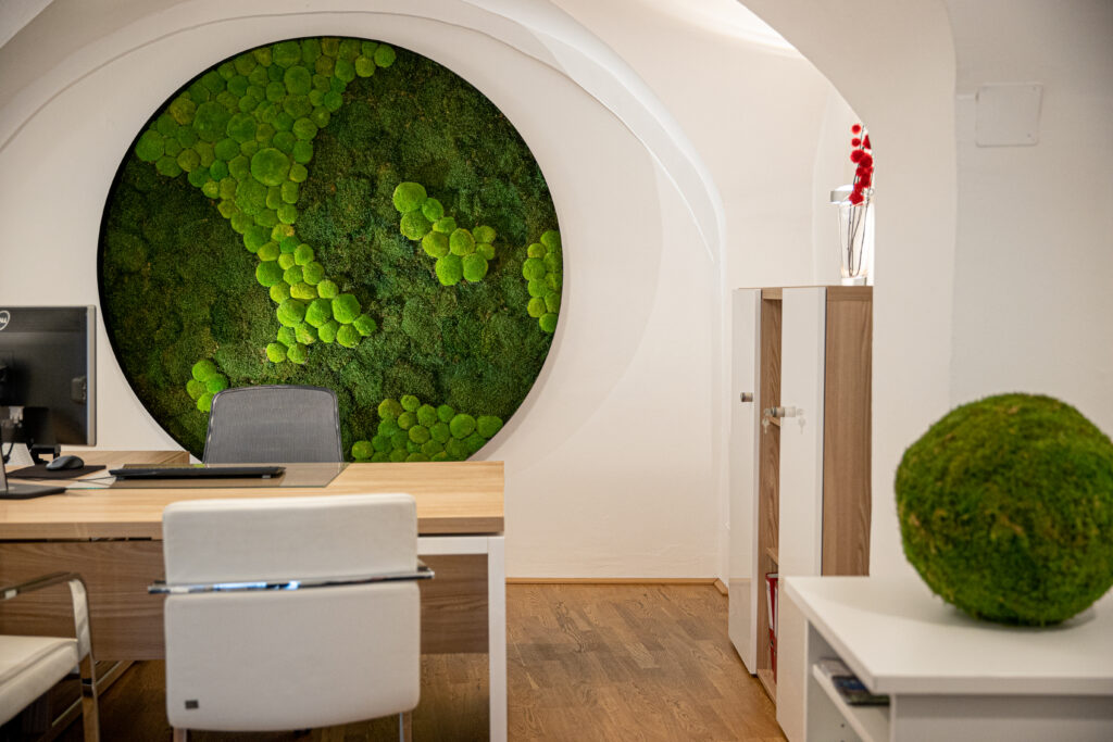 Ein eindrucksvolles Beispiel für die Integration von Moos in hochwertige Arbeitsumgebungen ist das Büro des Vorstandsdirektors der Münze Österreich AG, DI Dr. Manfred Matzinger-Leopold. Bei der Neugestaltung seines Büros entschied sich der Vorstand bewusst für eine großflächige Mooswand von WildesMoos, die heute das zentrale Gestaltungselement des Raumes bildet